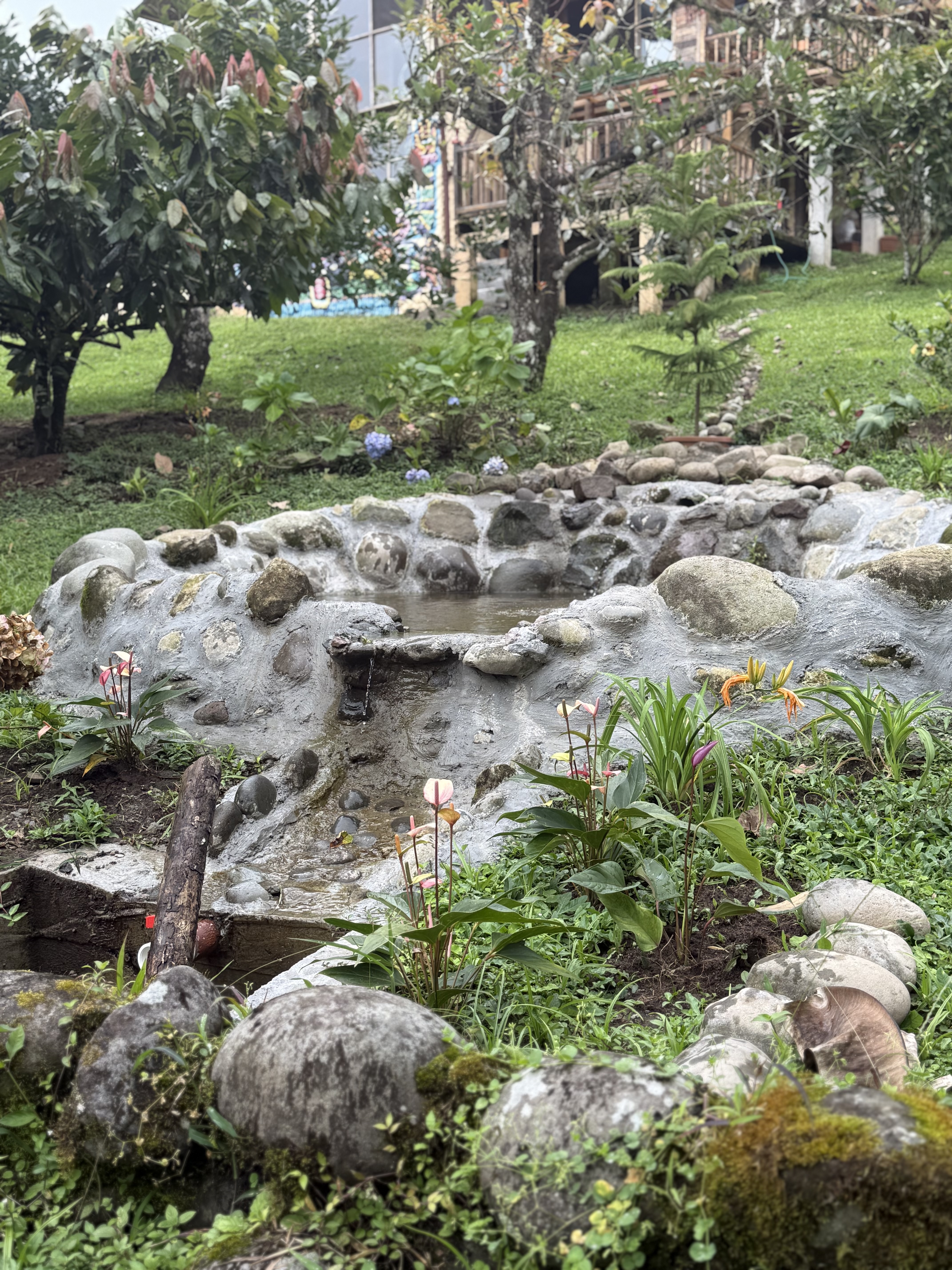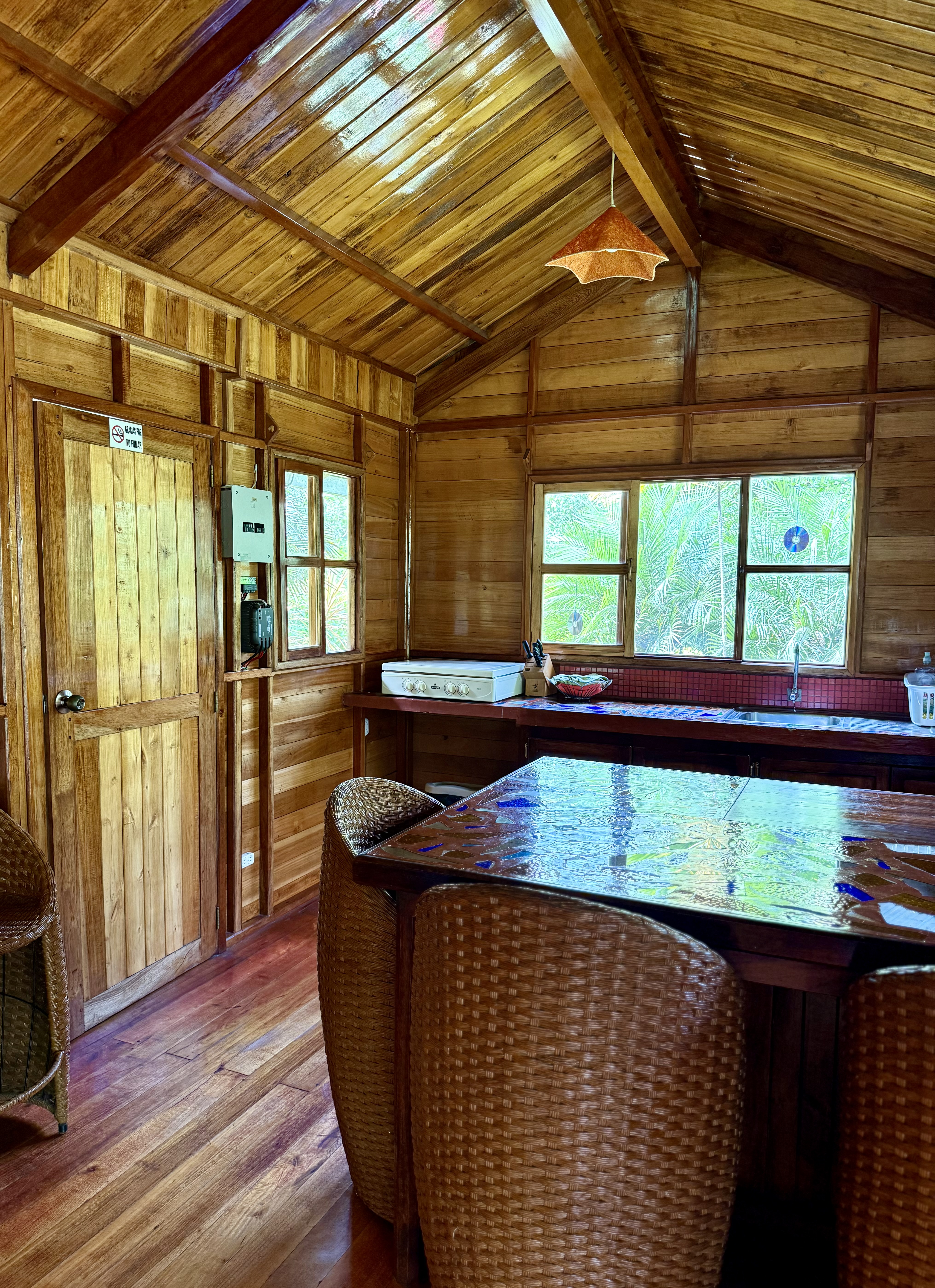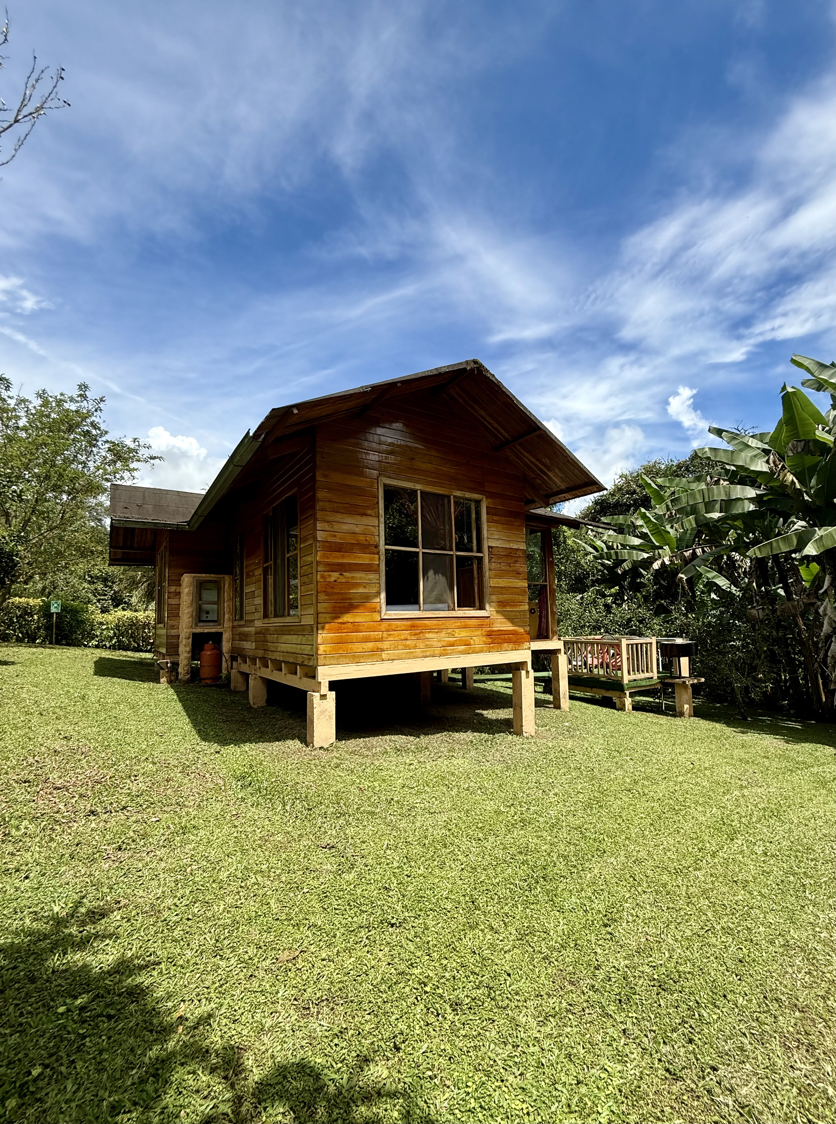 There are also covered outdoor areas including a relaxing gazebo with hammocks, surrounded by hummingbird feeders. Follow a trail over a bamboo bridge and through orchid-covered trees to the spring fed pool and wood burning sauna. There’s a bathroom and changing room by the pool, as well as lounge chairs and hammocks to relax.