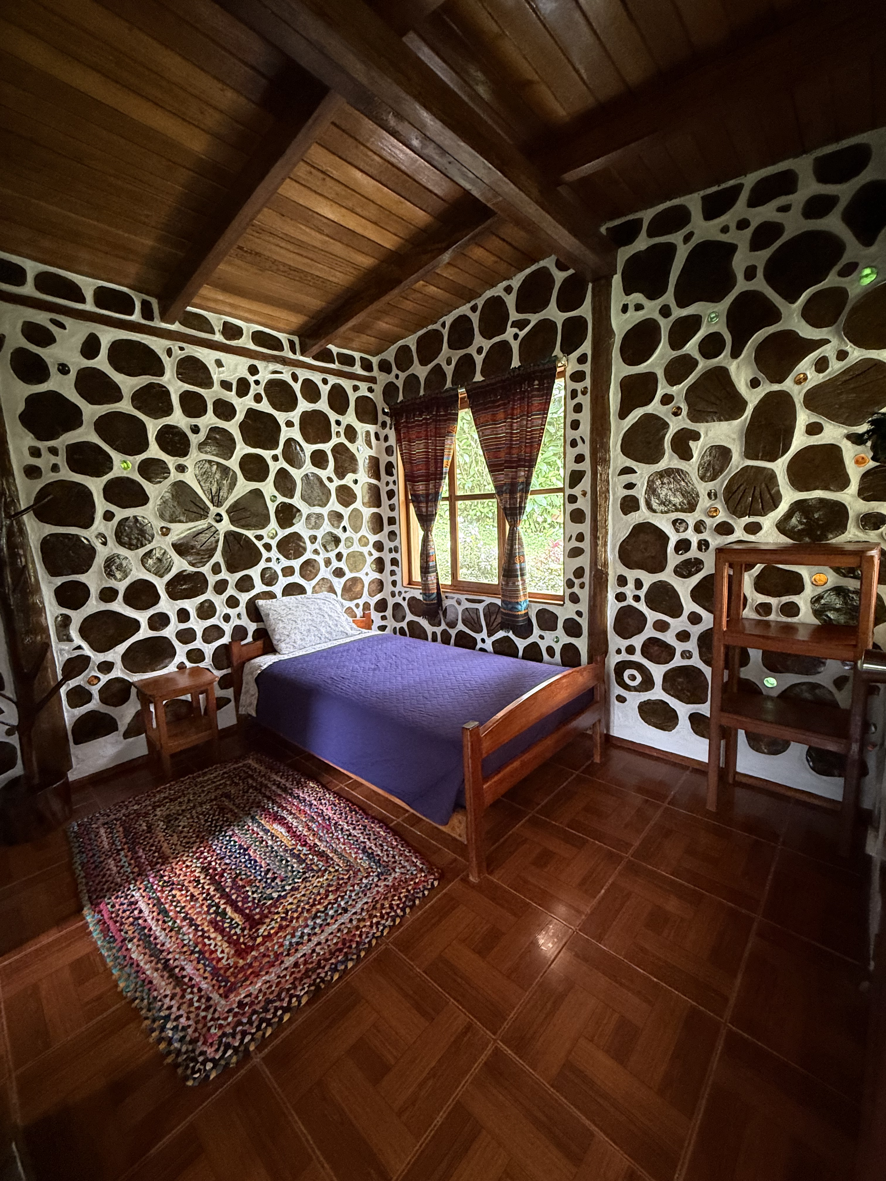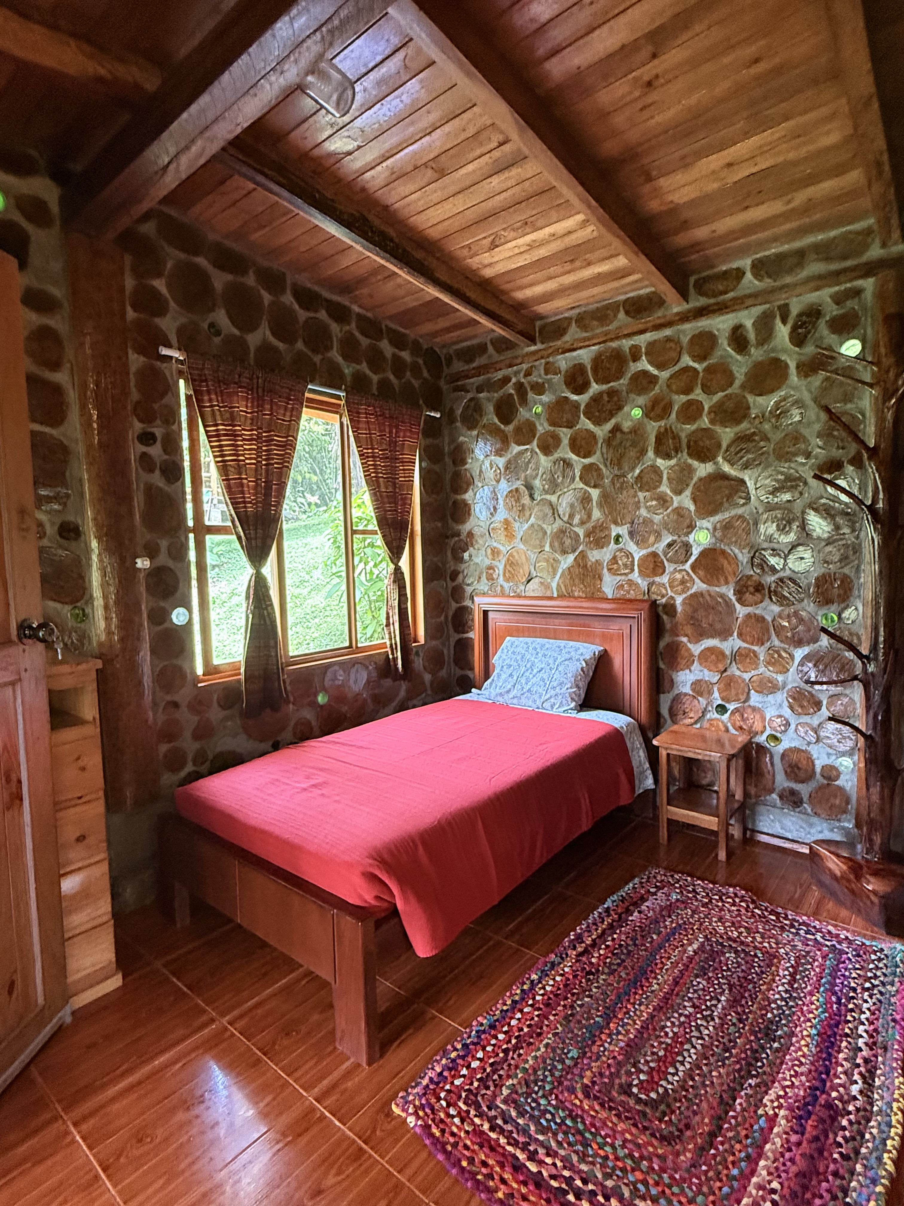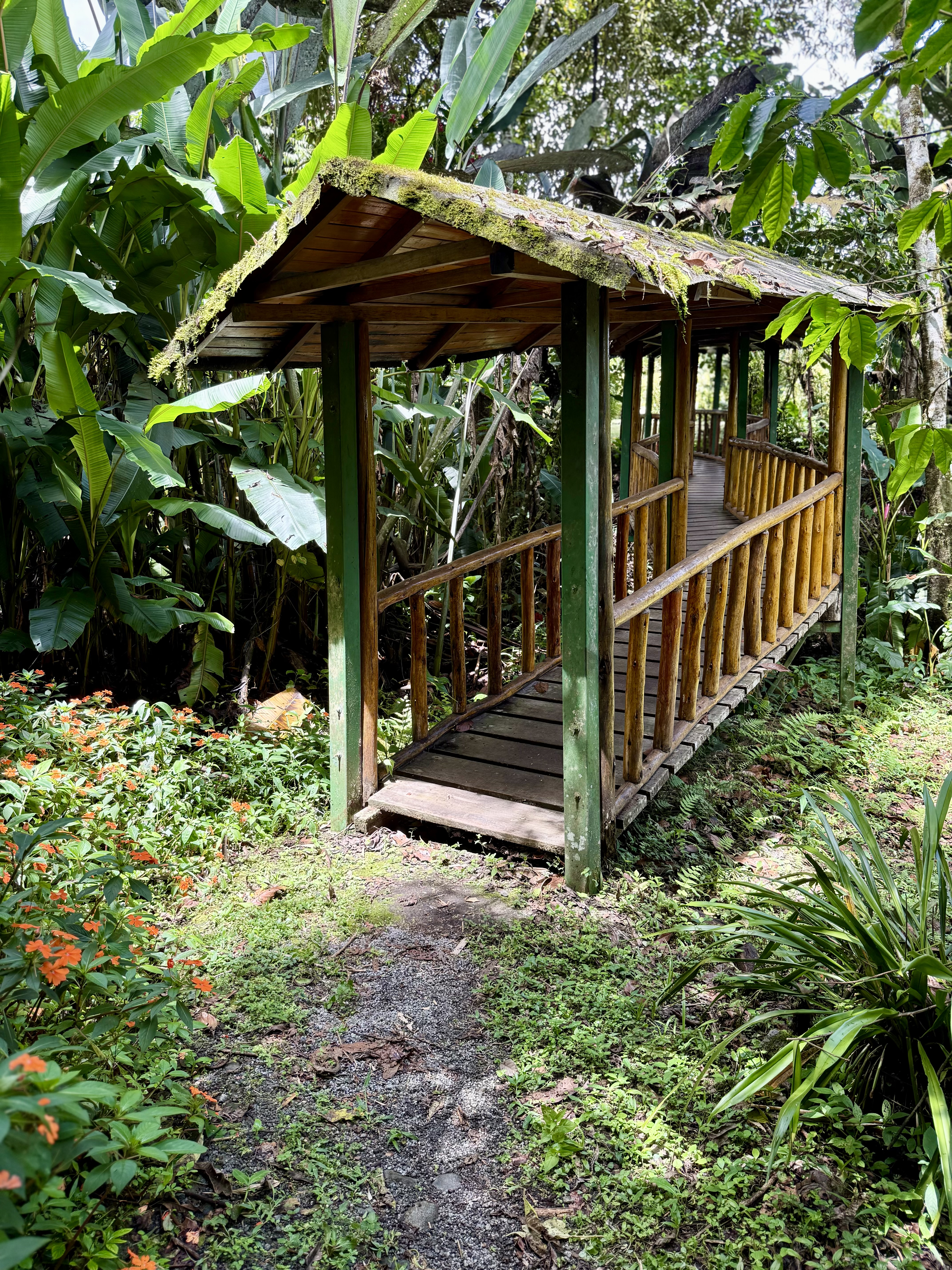 There are also covered outdoor areas including a relaxing gazebo with hammocks, surrounded by hummingbird feeders. Follow a trail over a bamboo bridge and through orchid-covered trees to the spring fed pool and wood burning sauna. There’s a bathroom and changing room by the pool, as well as lounge chairs and hammocks to relax.