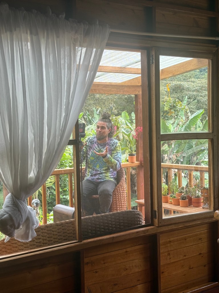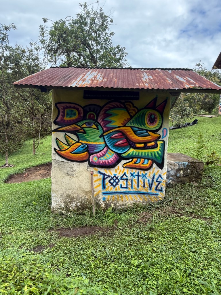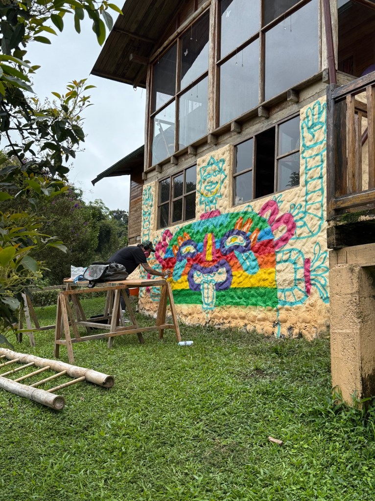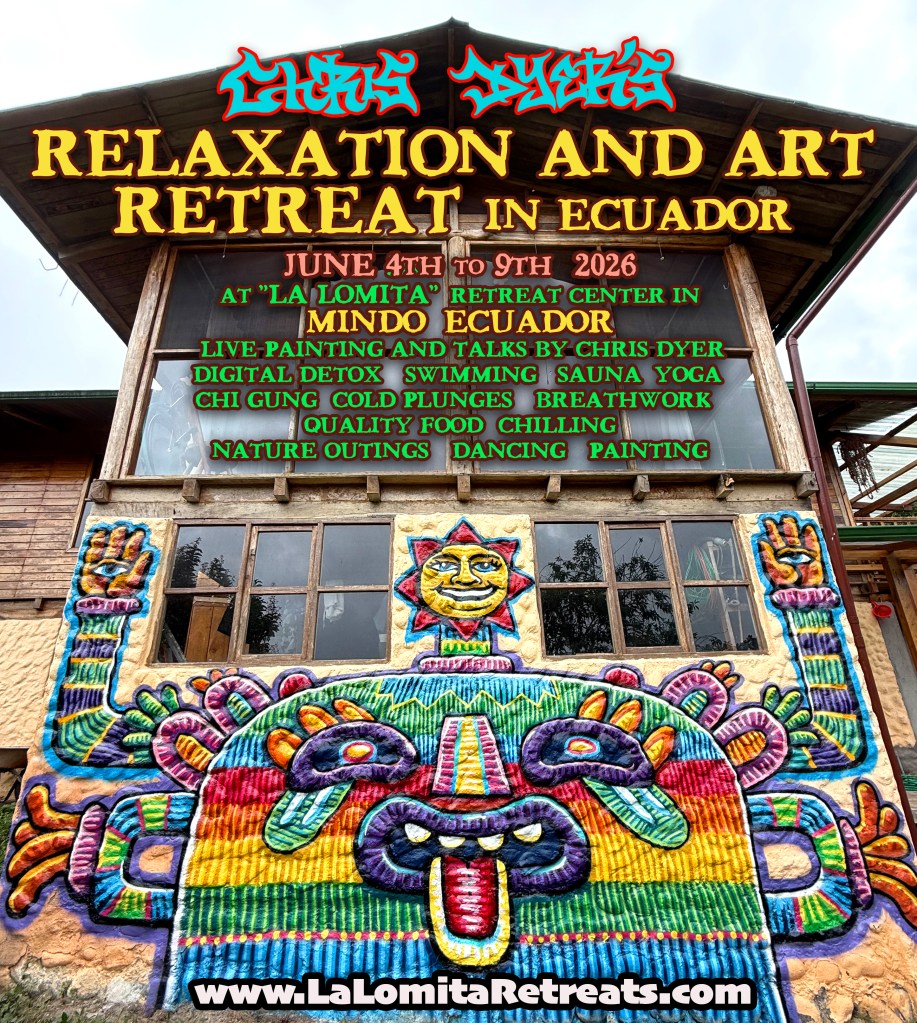 Come hang with us at La Lomita as we host Artist Chris Dyer for a 6 day retreat. Chris is a Peruvian-Canadian visual artist now residing in Saint Petersburg, Florida. As a world and dimensions traveler, he experiences different cultures and re-expresses them into his vision of Oneness. He serves as a bridge-builder between different art movements, from skateboard graphics, visionary paintings, street art murals and more. Chris wants to break the boxes and see everything becoming one harmonious reality. Chris’s art has been featured in many museums around the world including the Bob Marley Museum in Jamaica, the Straat Museum in Amsterdam, Entheon in New York, and more. Chris has had five books published so far and has been featured in many other art books and magazines worldwide. He also Sold Out a NFT of 5555 pieces back in 2021, creating a community called the “Galaktic Gang”. Though his subject matters are as varied as his styles, his art is just a reflection of his personal spiritual journey. At the start of 2026 we hosted Chris, and his wife Paulina, to come and paint a mural for us. What Chris created for La Lomita was a Portal of Positivity. I feel grateful and the magic it has added to our peaceful sanctuary is beyond words. Want to feel the vibration? Come spend 6 days disconnecting, relaxing and become one with the Mindo-Nambillo Cloud Forest.